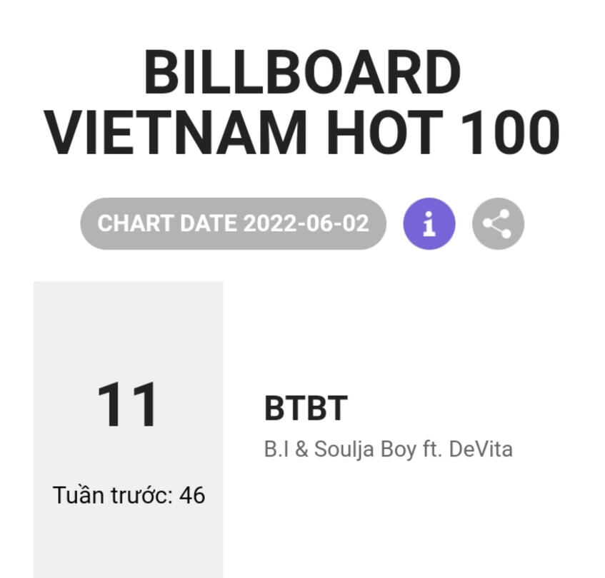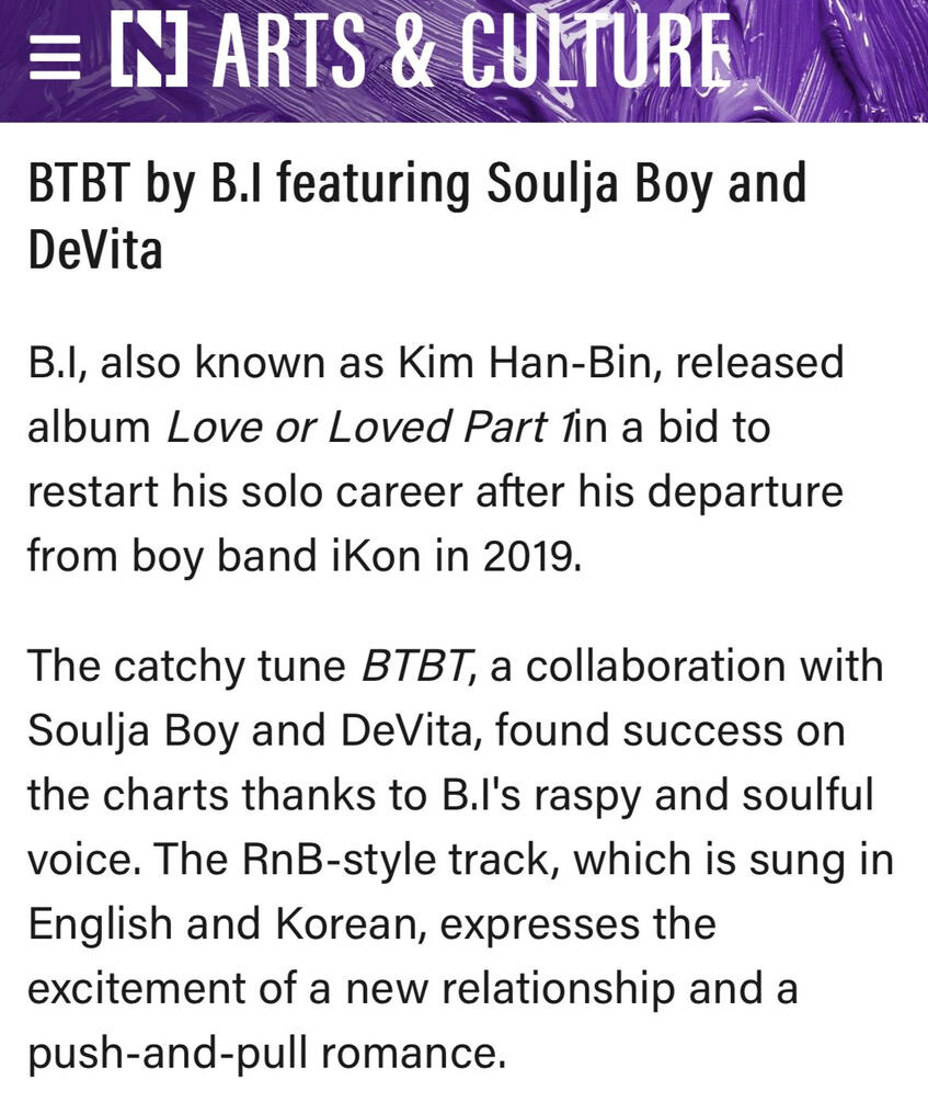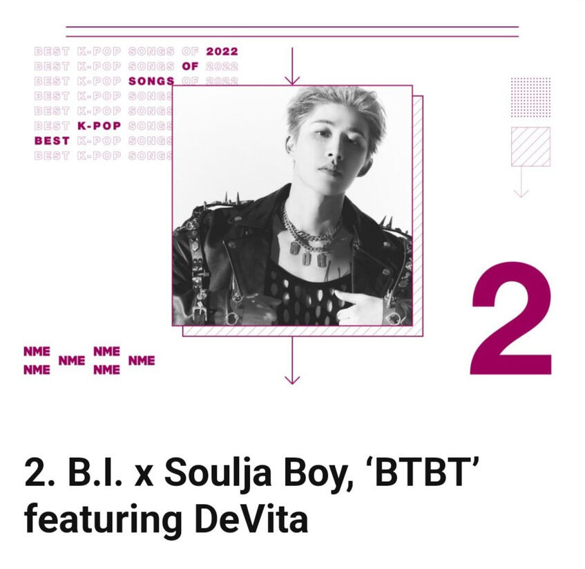 B.I's BTBT with Soulja Boy featuring DeVita also placed at no. 2 on NME's Top 25 Best K-Pop Songs of 2022.