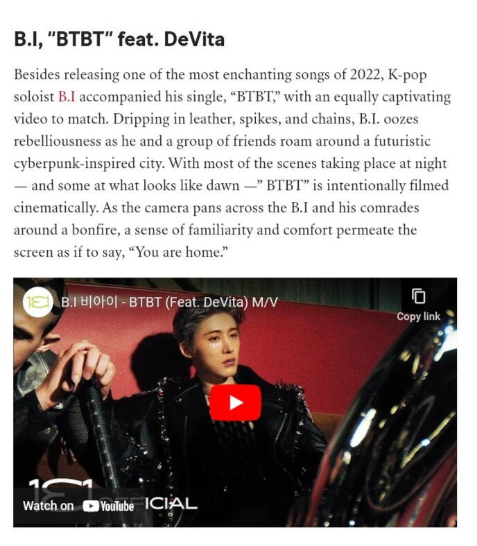 NYLON Magazine also listed B.I's BTBT with Soulja Boy featuring DeVita on their Top 20 Best K-Pop Songs of 2022.