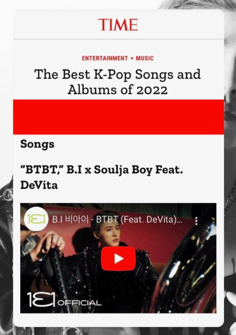 TIME Magazine named B.I's BTBT with Soulja Boy featuring DeVita as one of the Best K-Pop Songs of 2022.