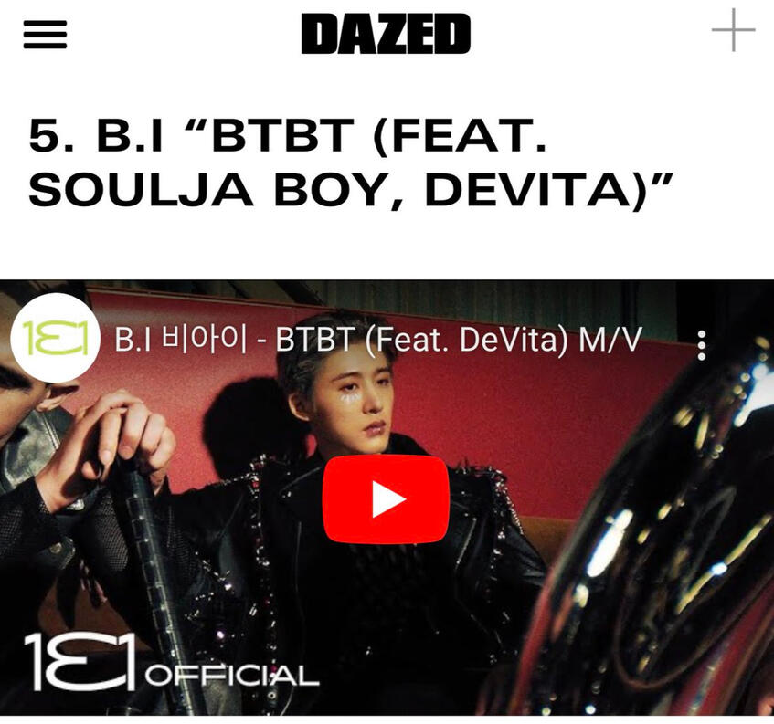 DAZED Magazine ranked B.I's BTBT with Soulja Boy featuring DeVita at no. 5 on Best K-Pop Songs of 2022.
